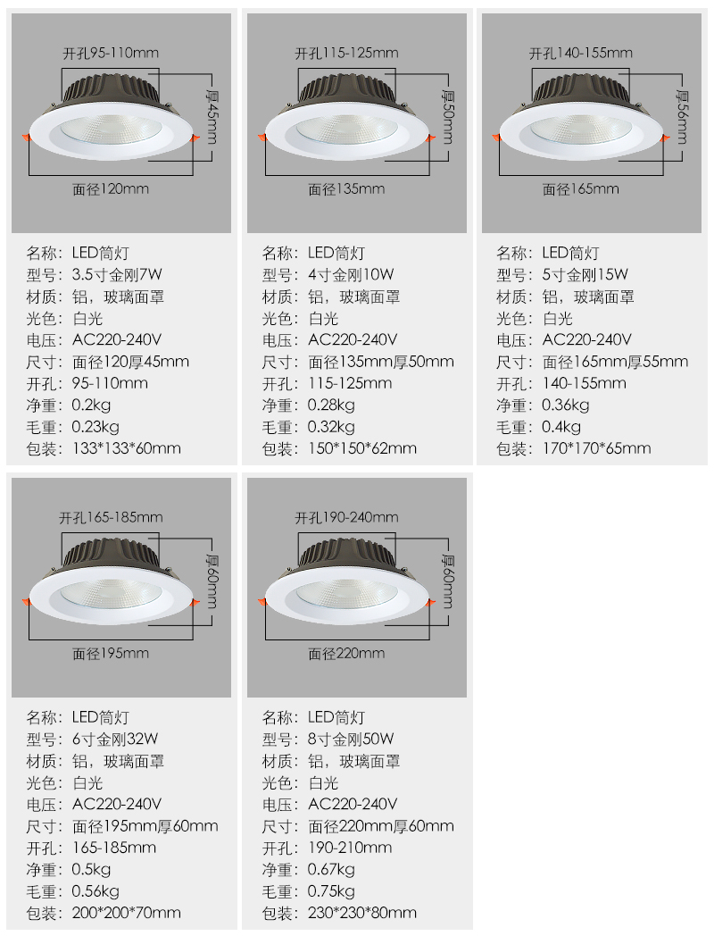 格瑞捷LED筒灯8寸金刚50W白光/个