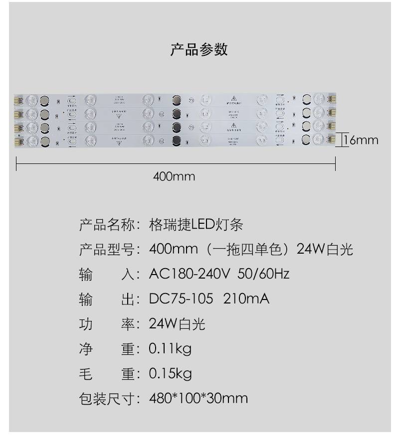 格瑞捷LED灯条400mm(一拖四单色)24W 白光/个