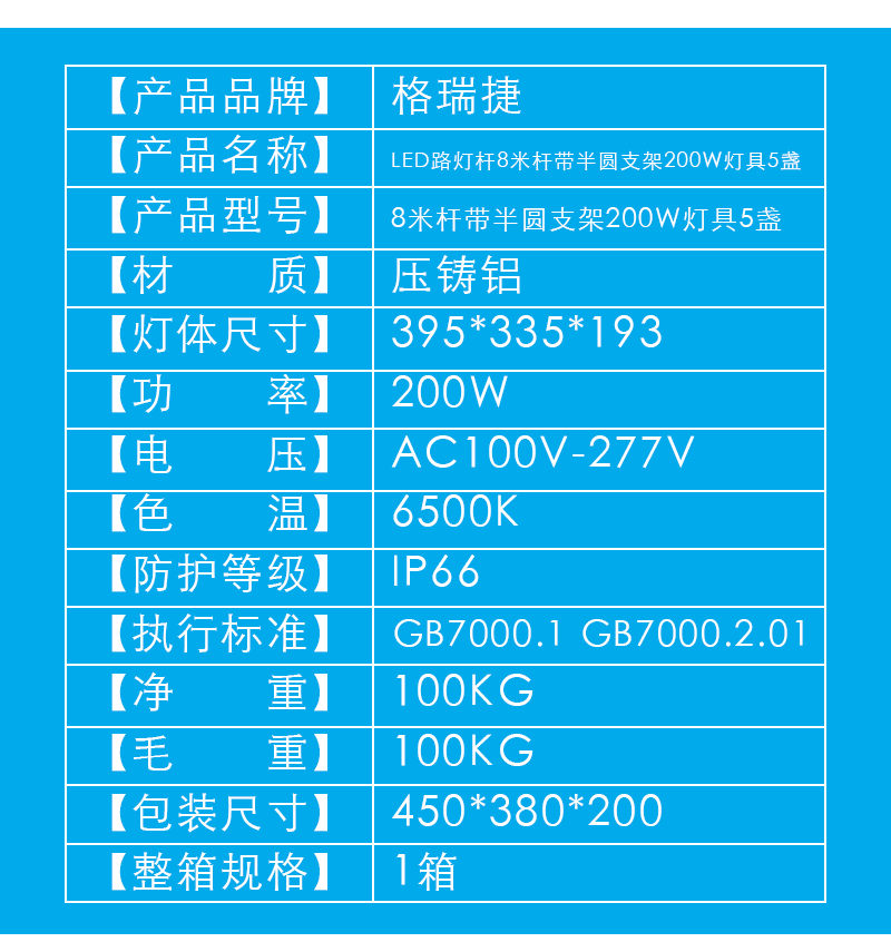 格瑞捷 8米杆带半圆支架200w灯具5盏/套